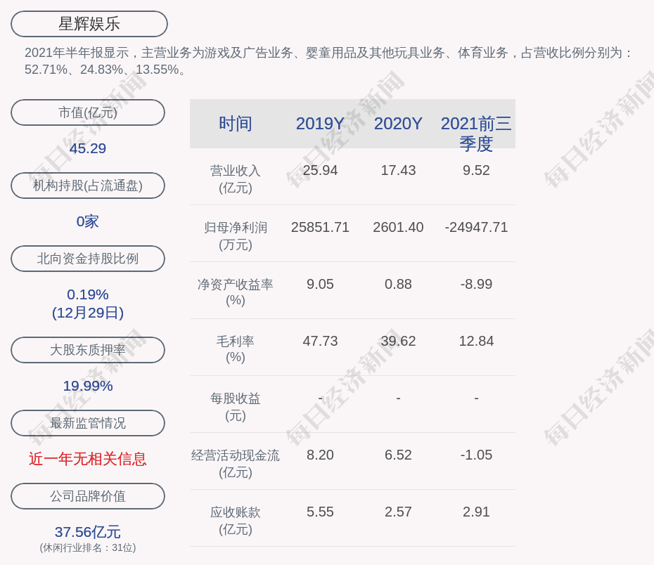 2021年半年报显示,星辉娱乐的主营业务为游戏及广告业务、婴童用品及其他玩具业务、体育业务,占营收比例分别为:52.71%、24.83%、13.55%。
