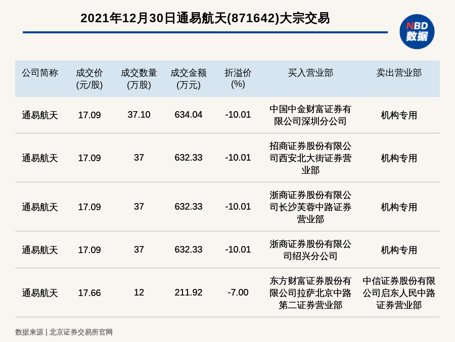 每经讯,2021年12月30日,北交所上市公司通易航天(871642)发生5笔大宗交易,总成交金额为2742.95万元,其中一笔成交价17.09元/股,成交数量37.10万股,成交金额634.04万元,折价10.01%,买入营业部是中国中金财富证券有限公司深圳分公司,卖出席位是机构专用。