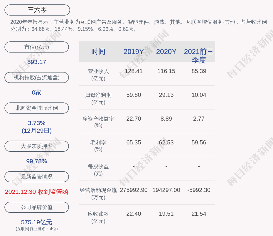 2020年年报显示,三六零的主营业务为互联网广告及服务、智能硬件、游戏、其他、互联网增值服务-其他,占营收比例分别为:64.68%、18.44%、9.15%、6.96%、0.62%。