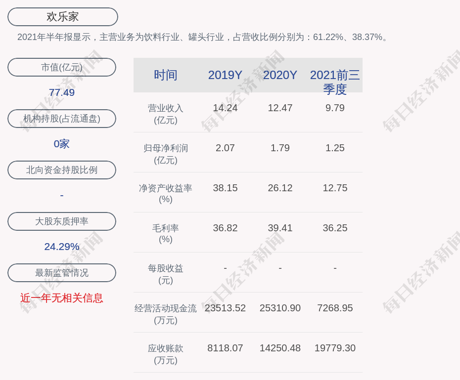 2021年半年报显示,欢乐家的主营业务为饮料行业、罐头行业,占营收比例分别为:61.22%、38.37%。