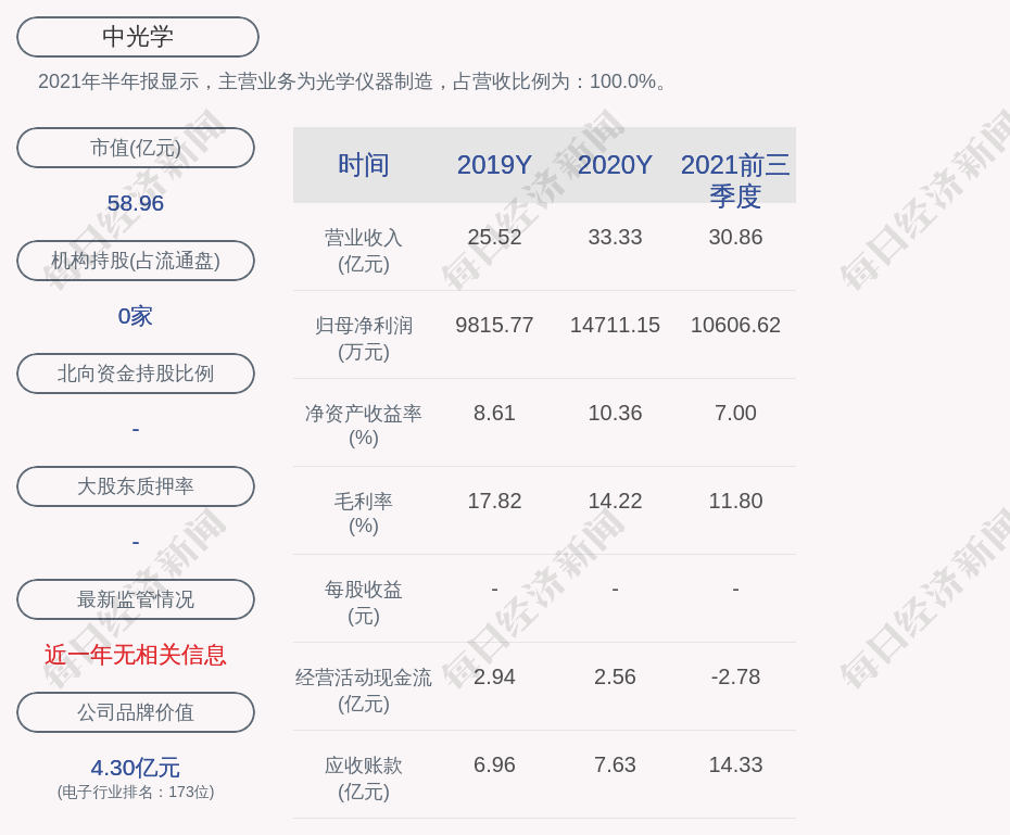 2021年半年报显示,中光学的主营业务为光学仪器制造,占营收比例为:100.0%。