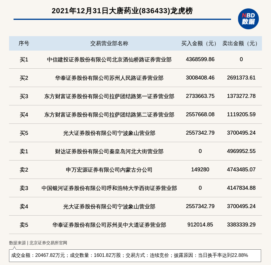 每经讯,2021年12月31日,北交所上市公司大唐药业(836433)登上龙虎榜,交易方式是连续竞价,披露原因是当日换手率达到22.88%,成交数量1601.82万股,成交金额20467.82万元。买一席位为中信建投证券股份有限公司北京酒仙桥路证券营业部,买入436.86万元;卖一席位为财达证券股份有限公司秦皇岛河北大街营业部,卖出497万元。