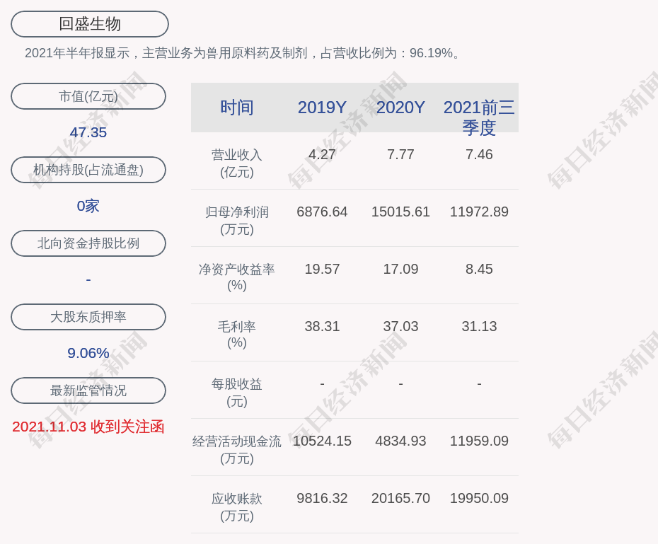 2021年半年报显示,回盛生物的主营业务为兽用原料药及制剂,占营收比例为:96.19%。
