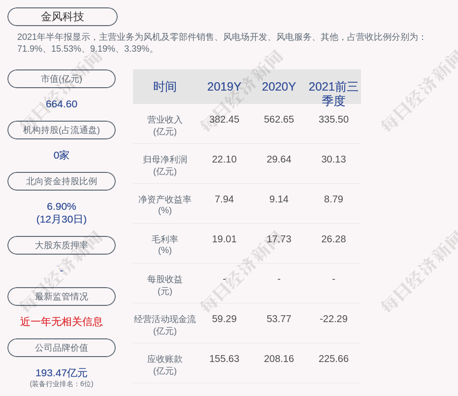 2021年半年报显示,金风科技的主营业务为风机及零部件销售、风电场开发、风电服务、其他,占营收比例分别为:71.9%、15.53%、9.19%、3.39%。