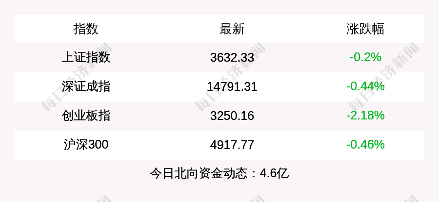 每经AI快讯:北京时间1月4日15:00,上证指数收盘下跌7.45点,跌幅为0.2%,报收3632.33点,成交额5102.51亿元;深证成指收盘下跌66.04点,跌幅为0.44%,报收14791.31点,成交额7560.73亿元;创业板指收盘下跌72.51点,跌幅为2.18%,报收3250.16点,成交额2978.19亿元;沪深300收盘下跌22.6点,跌幅为0.46%,报收4917.77点,成交额3365.17亿元。北上资金当日净流入4.6亿元。