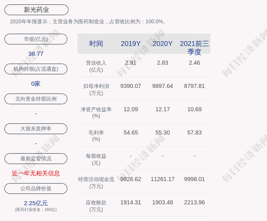 2020年年报显示,新光药业的主营业务为医药制造业,占营收比例为:100.0%。