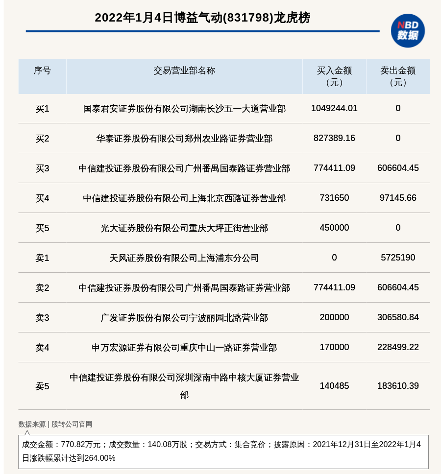 每经讯,2022年1月4日,新三板创新层公司博益气动(831798)登上龙虎榜,交易方式是集合竞价,披露原因是2021年12月31日至2022年1月4日涨跌幅累计达到264.00%,成交数量140.08万股,成交金额770.82万元。买一席位为国泰君安证券股份有限公司湖南长沙五一大道营业部,买入104.92万元;卖一席位为天风证券股份有限公司上海浦东分公司,卖出572.52万元。