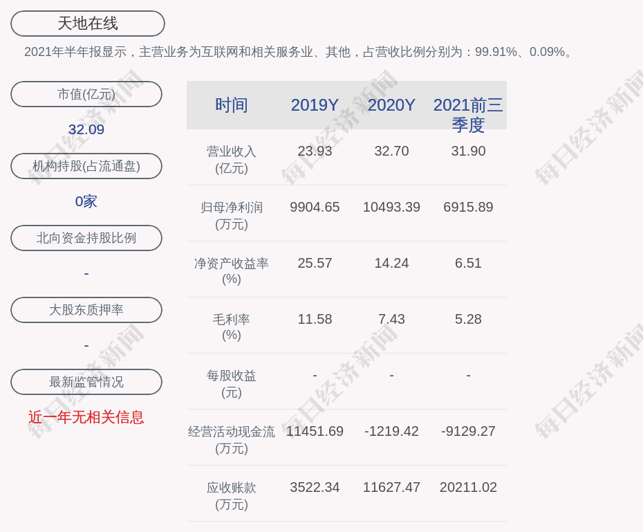 2021年半年报显示,天地在线的主营业务为互联网和相关服务业、其他,占营收比例分别为:99.91%、0.09%。