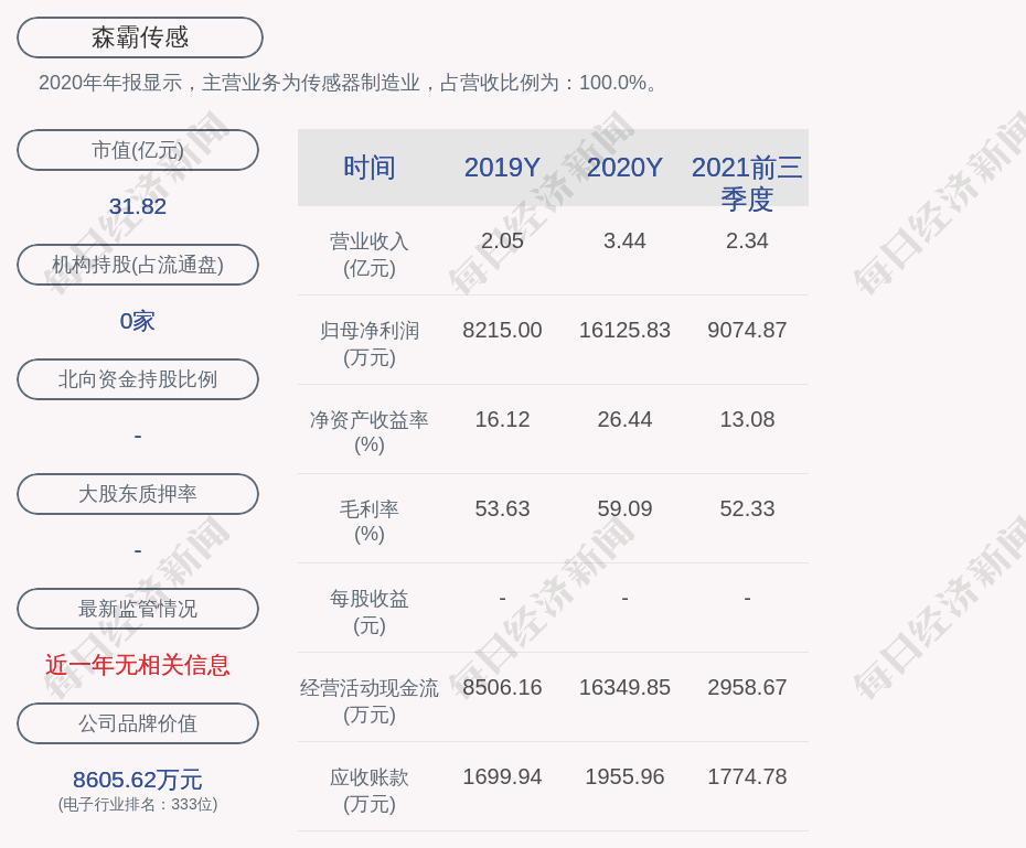 2020年年报显示,森霸传感的主营业务为传感器制造业,占营收比例为:100.0%。