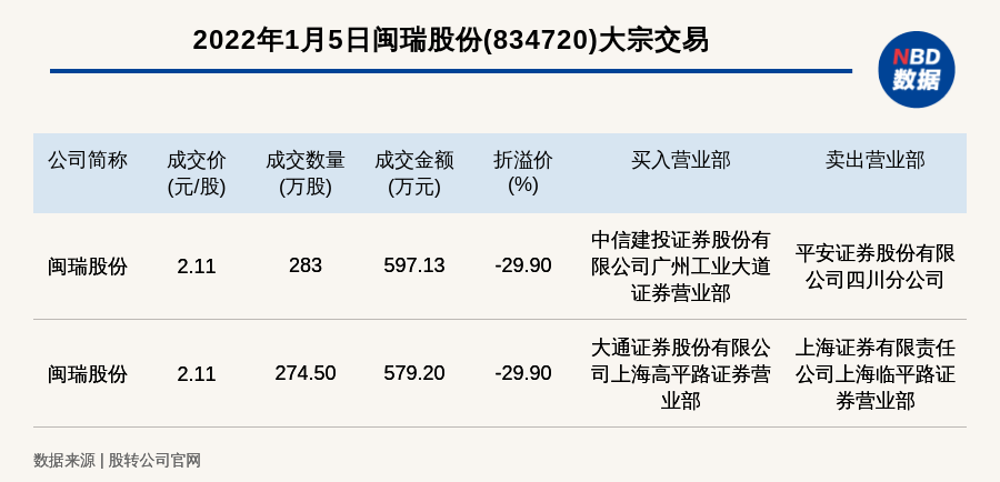 每经讯,2022年1月5日,新三板创新层公司闽瑞股份(834720)发生2笔大宗交易,总成交金额为1176.32万元,成交金额最高的一笔成交价2.11元/股,成交数量283万股,成交金额597.13万元,折价29.9%。买入营业部是中信建投证券股份有限公司广州工业大道证券营业部,卖出营业部是平安证券股份有限公司四川分公司。