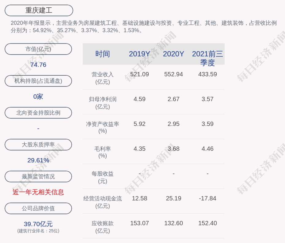 2020年年报显示,重庆建工的主营业务为房屋建筑工程、基础设施建设与投资、专业工程、其他、建筑装饰,占营收比例分别为:54.92%、35.27%、3.37%、3.32%、1.53%。