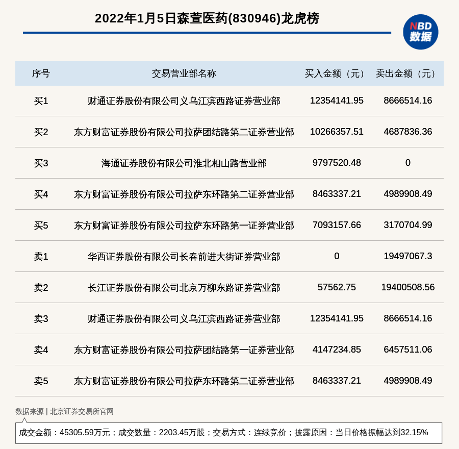 每经讯,2022年1月5日,北交所上市公司森萱医药(830946)登上龙虎榜,交易方式是连续竞价,披露原因是当日价格振幅达到32.15%,成交数量2203.45万股,成交金额4.53亿元。买一席位为财通证券股份有限公司义乌江滨西路证券营业部,买入1235.41万元;卖一席位为华西证券股份有限公司长春前进大街证券营业部,卖出1949.71万元。