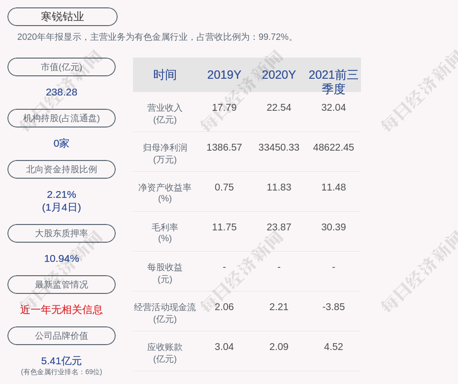 2020年年报显示,寒锐钴业的主营业务为有色金属行业,占营收比例为:99.72%。