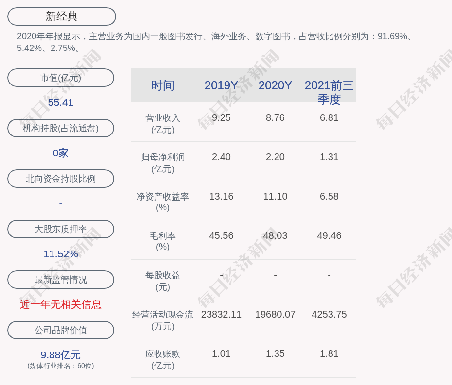 2020年年报显示,新经典的主营业务为国内一般图书发行、海外业务、数字图书,占营收比例分别为:91.69%、5.42%、2.75%。