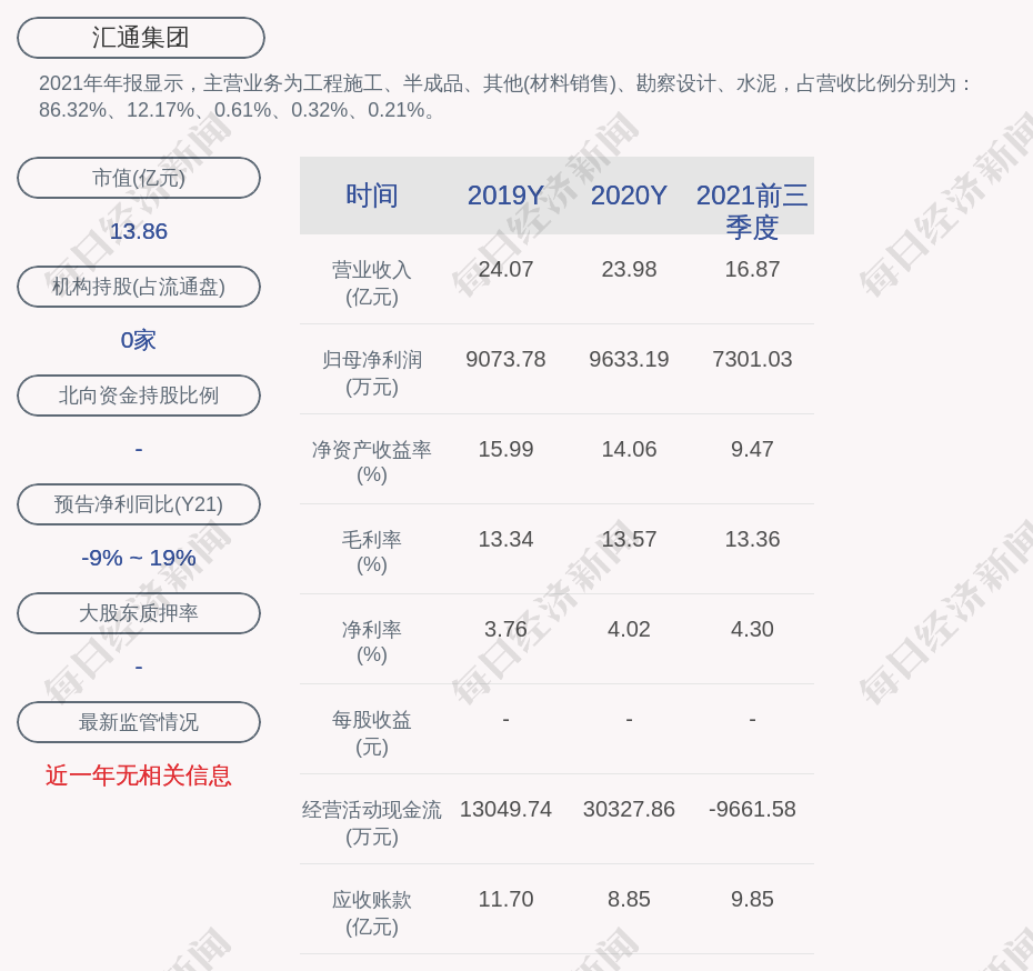 2021年年报显示,汇通集团的主营业务为工程施工、半成品、其他(材料销售)、勘察设计、水泥,占营收比例分别为:86.32%、12.17%、0.61%、0.32%、0.21%。