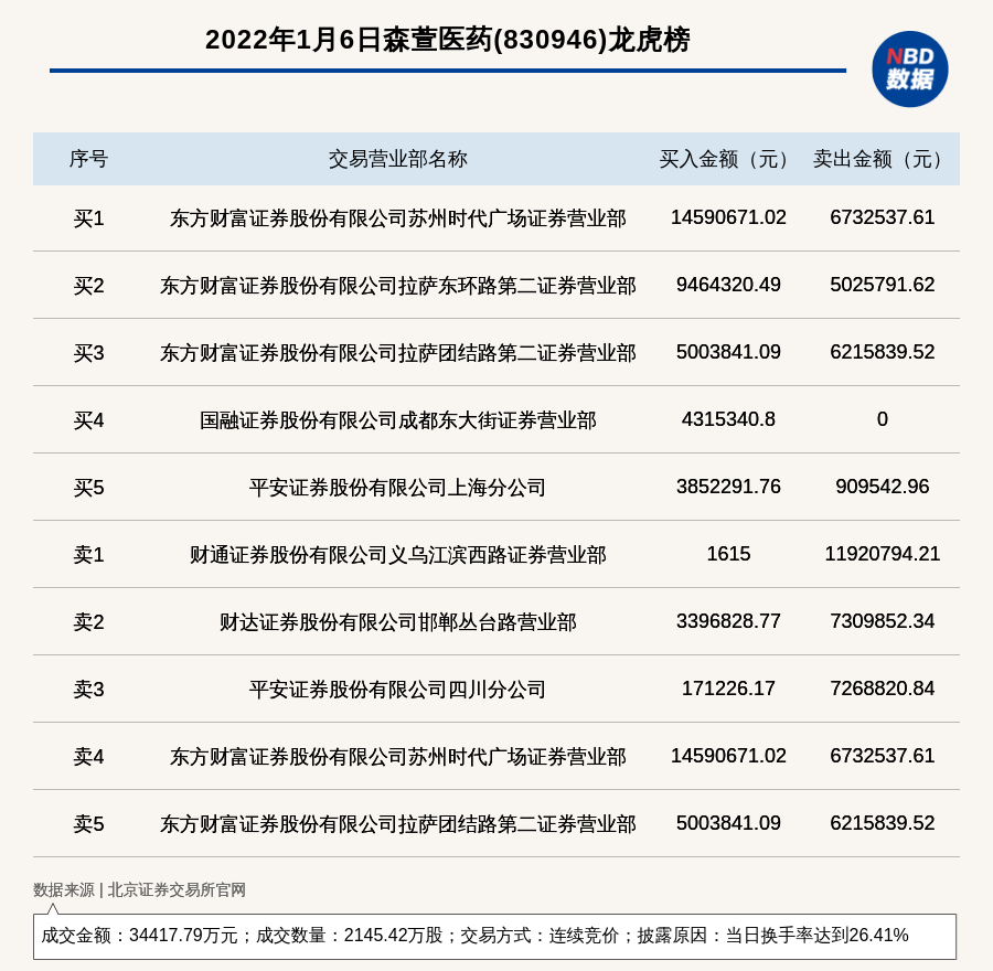 每经讯,2022年1月6日,北交所上市公司森萱医药(830946)登上龙虎榜,交易方式是连续竞价,披露原因是当日换手率达到26.41%,成交数量2145.42万股,成交金额34417.79万元。买一席位为东方财富证券股份有限公司苏州时代广场证券营业部,买入1459.07万元;卖一席位为财通证券股份有限公司义乌江滨西路证券营业部,卖出1192.08万元。