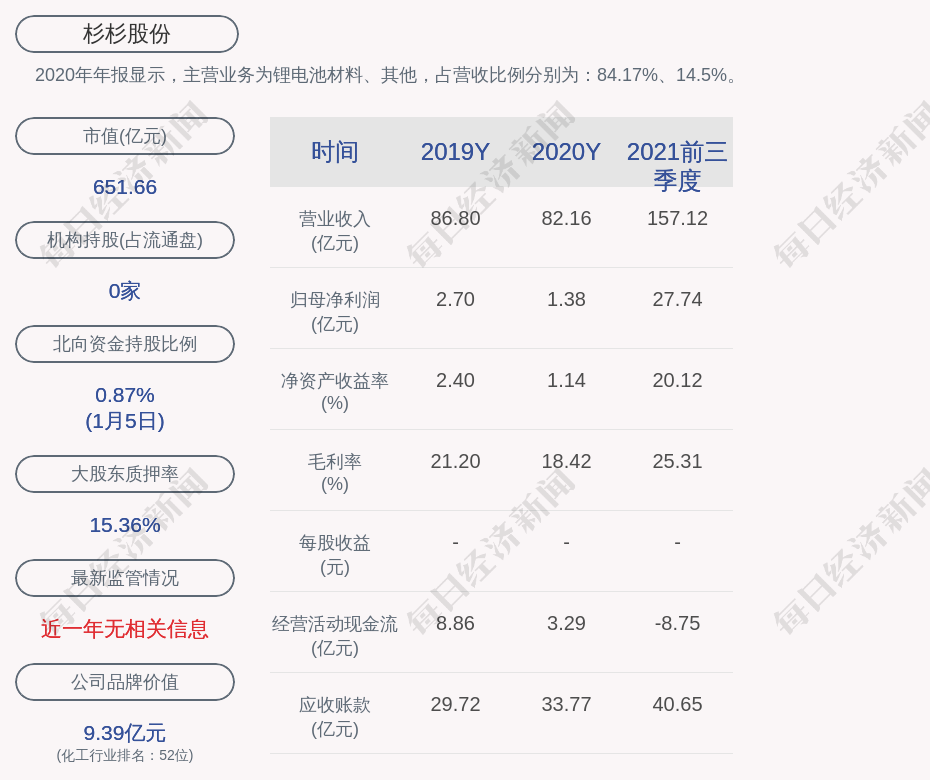 2020年年报显示,杉杉股份的主营业务为锂电池材料、其他,占营收比例分别为:84.17%、14.5%。