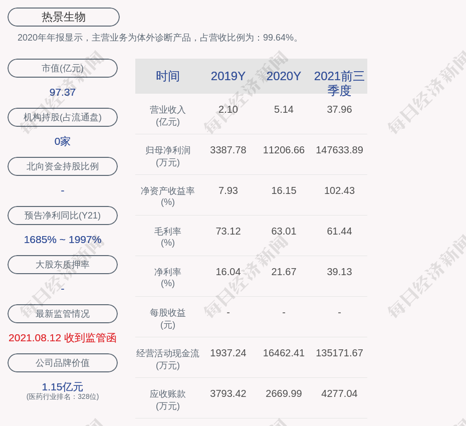 2020年年报显示,热景生物的主营业务为体外诊断产品,占营收比例为:99.64%。