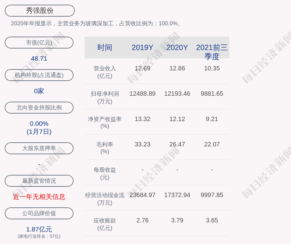 2020年年报显示,秀强股份的主营业务为玻璃深加工,占营收比例为:100.0%。