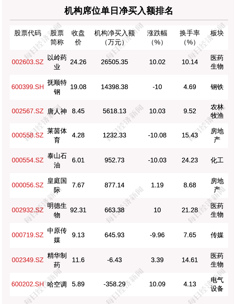 在龙虎榜中,涉及机构专用席位的个股有13只,净买入额前三的是以岭药业、抚顺特钢、唐人神,分别为2.65亿元、1.44亿元、5618.13万元。