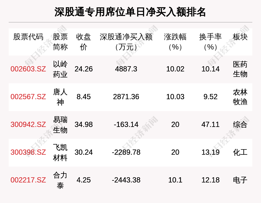 在龙虎榜中,涉及深股通专用席位的个股有5只,以岭药业的深股通专用席位净买入额最大,净买入4887.3万元。