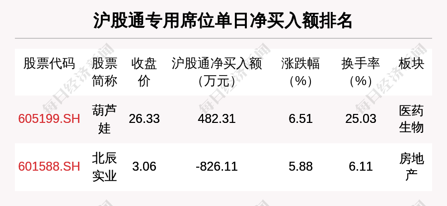 在龙虎榜中,涉及沪股通专用席位的个股有2只,葫芦娃的沪股通专用席位净买入额最大,净买入482.31万元。