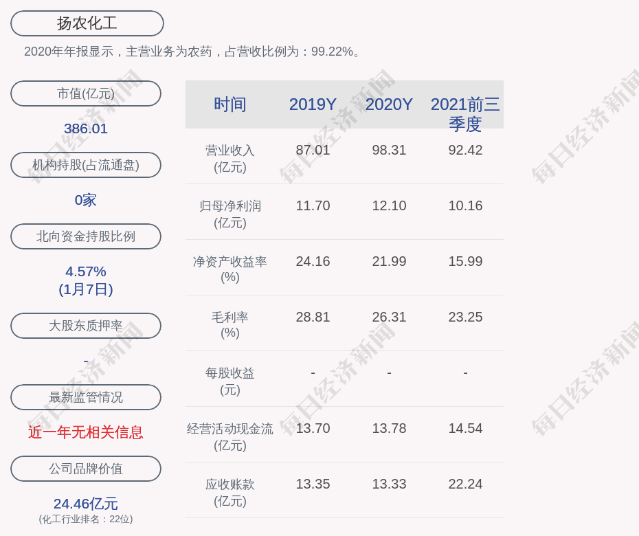 2020年年报显示,扬农化工的主营业务为农药,占营收比例为:99.22%。