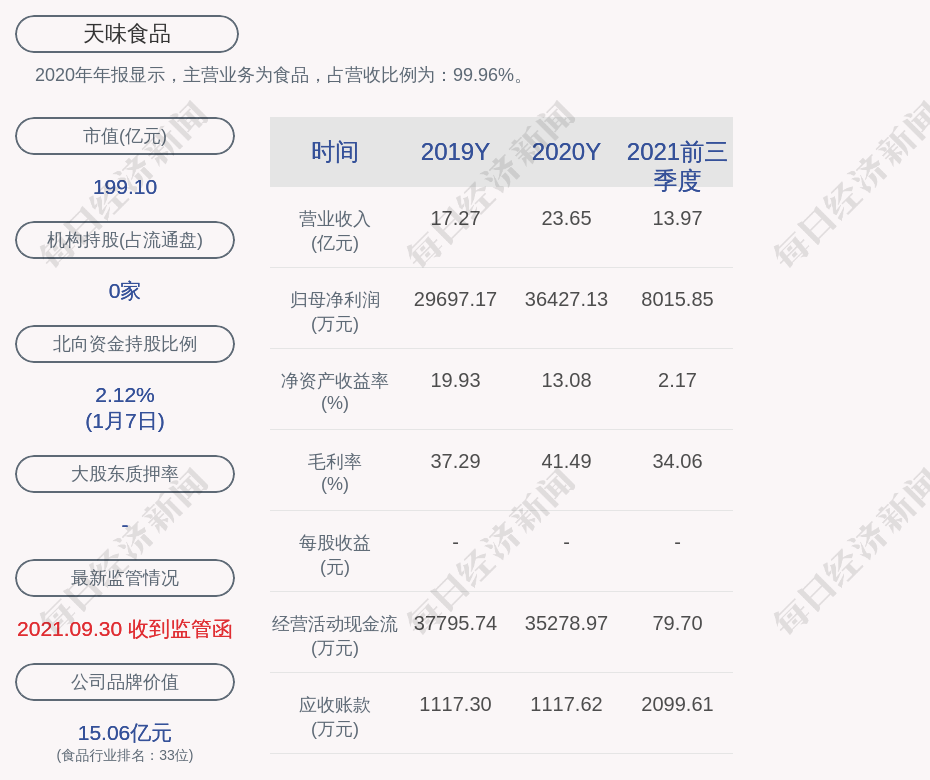 2020年年报显示,天味食品的主营业务为食品,占营收比例为:99.96%。