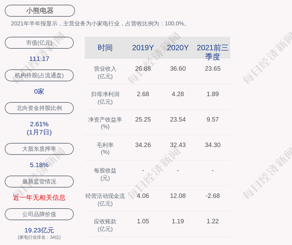 2021年半年报显示,小熊电器的主营业务为小家电行业,占营收比例为:100.0%。