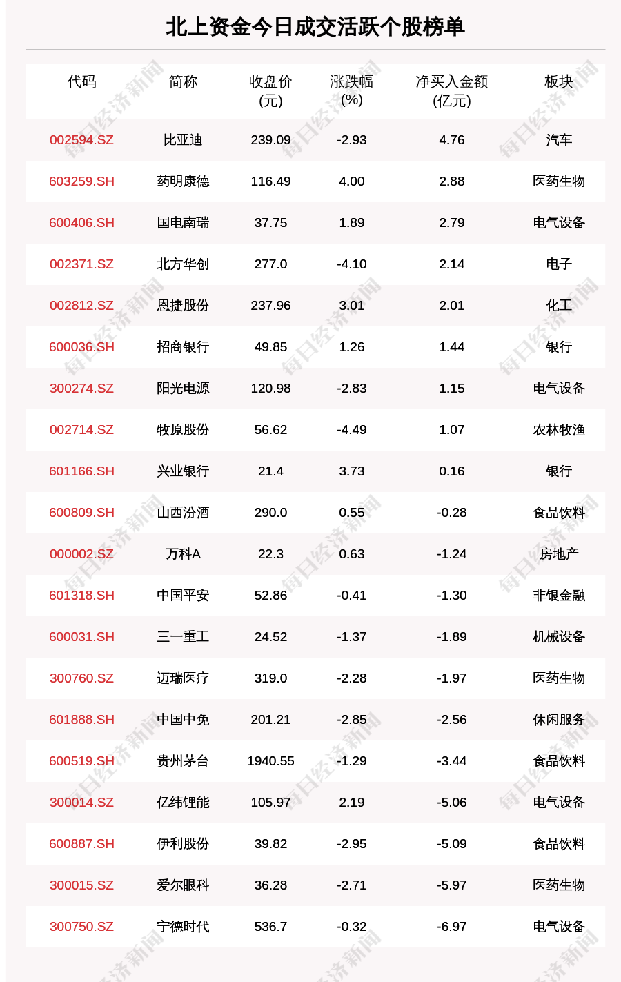 1月11日,北上资金成交活跃个股榜单中,净买入个股共9只,金额最多的是比亚迪(002594.SZ,收盘价:239.09元),净买入4.757亿元;净卖出个股共11只,金额最多的是宁德时代(300750.SZ,收盘价:536.7元),净卖出6.966亿元。