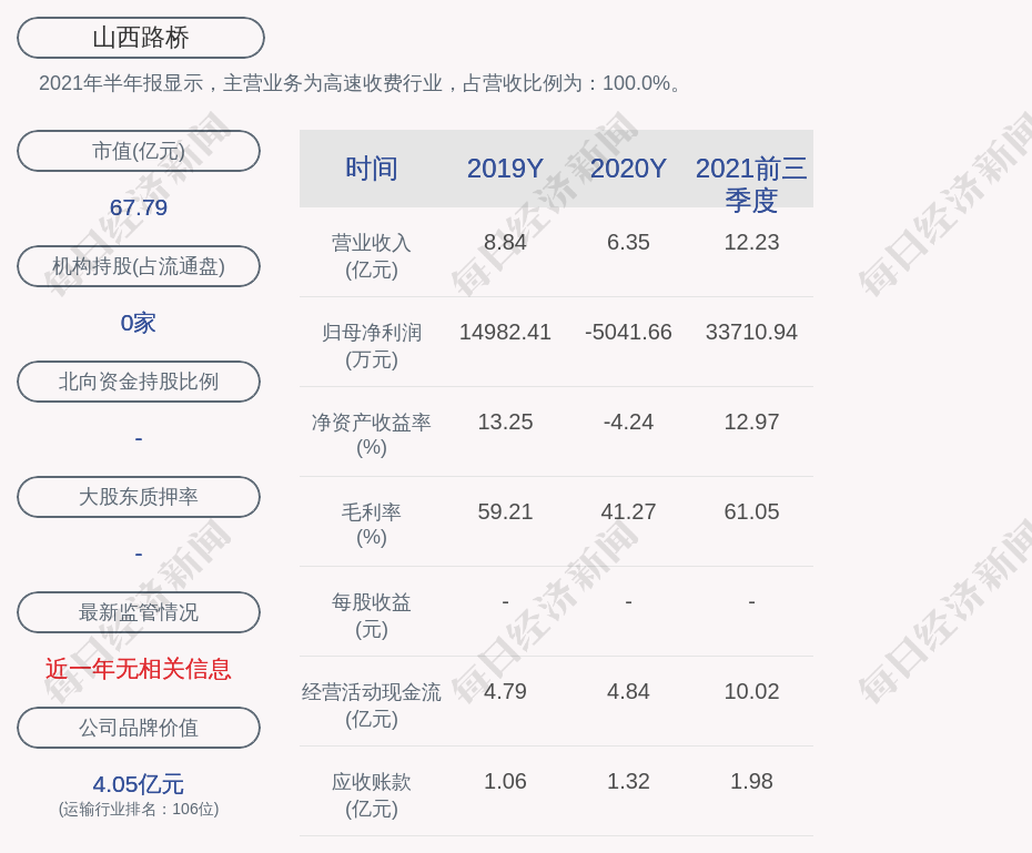 2021年半年报显示,山西路桥的主营业务为高速收费行业,占营收比例为:100.0%。