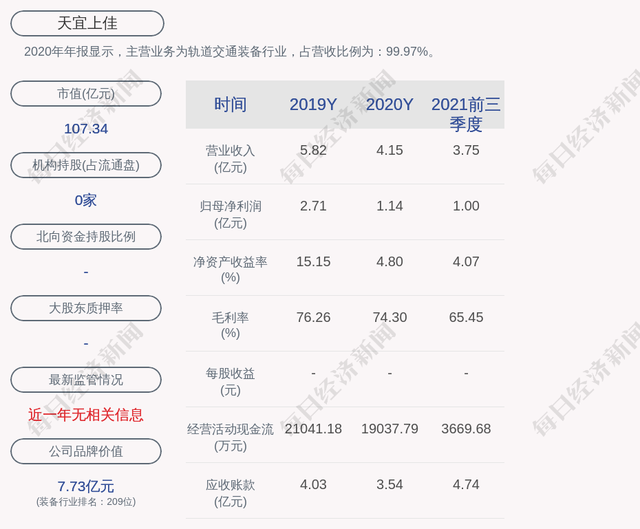 2020年年报显示,天宜上佳的主营业务为轨道交通装备行业,占营收比例为:99.97%。