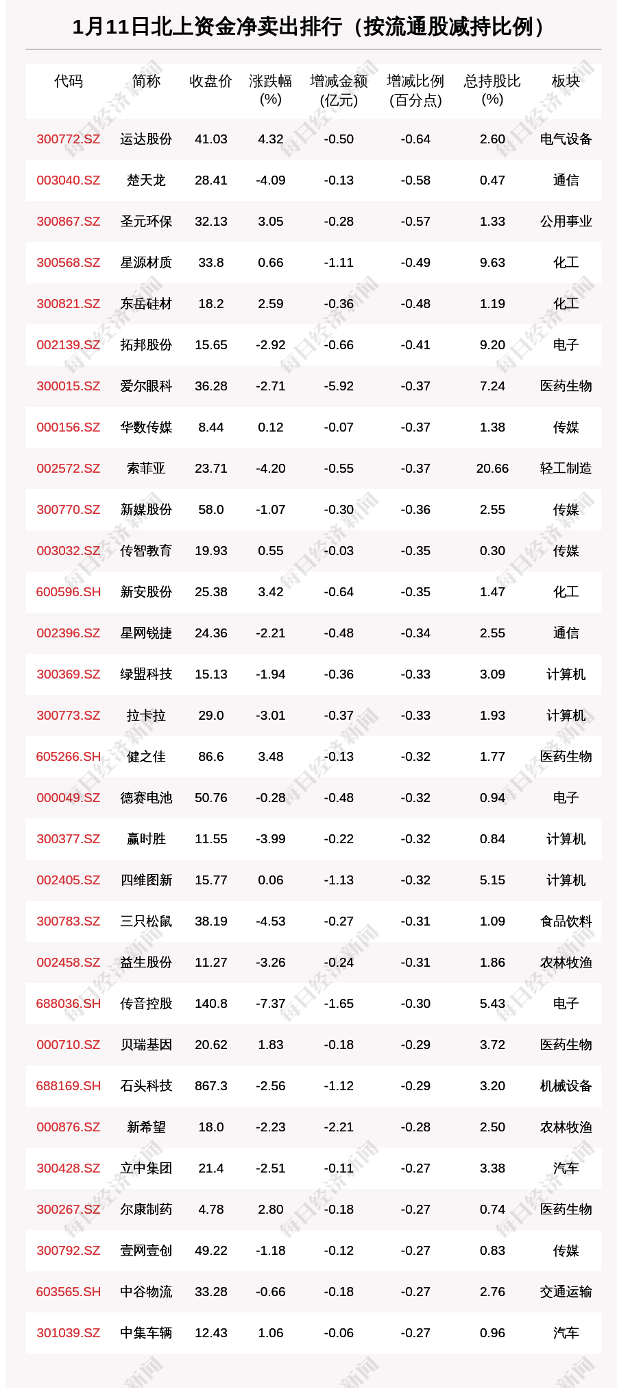 每经AI快讯,1月11日,北上资金净卖出的个股共有791只,北上资金减仓比例超1%的有671只。其中,运达股份(300772.SZ,收盘价:41.03元)减仓比例最为明显,最新持股比例2.60%,环比减少0.64个百分点。其他北上资金减仓比例较多的个股还包括楚天龙(003040.SZ,收盘价:28.41元)、圣元环保(300867.SZ,收盘价:32.13元)、星源材质(300568.SZ,收盘价:33.8元)。