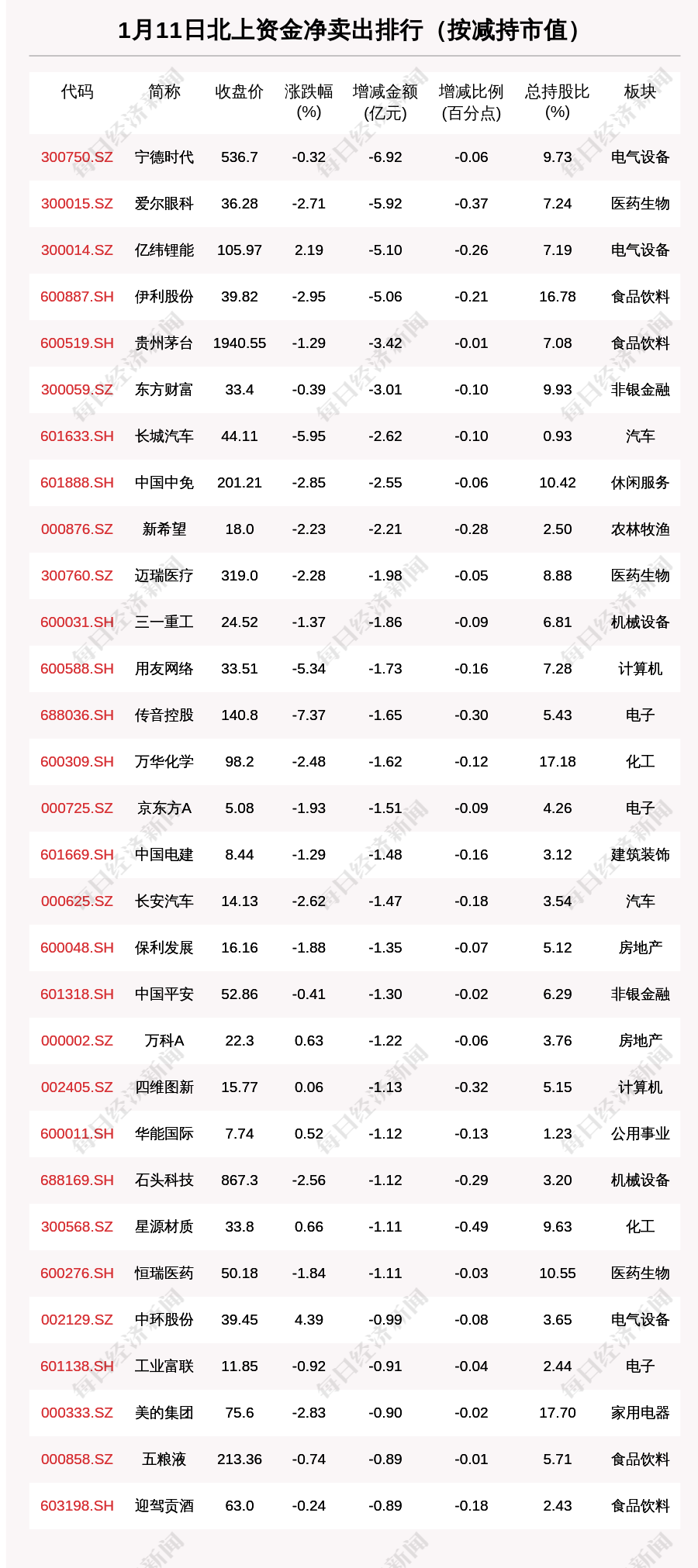 1月11日,按照北向资金减持市值排序,宁德时代(300750.SZ,收盘价:536.7元)减持市值最大,减持市值6.925亿元,环比减少0.64%。其他北上资金减持市值较多的个股还包括爱尔眼科(300015.SZ,收盘价:36.28元)、亿纬锂能(300014.SZ,收盘价:105.97元)、伊利股份(600887.SH,收盘价:39.82元)。