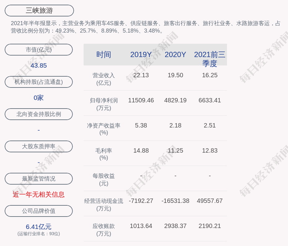 2021年半年报显示,三峡旅游的主营业务为乘用车4S服务、供应链服务、旅客出行服务、旅行社业务、水路旅游客运,占营收比例分别为:49.23%、25.7%、8.89%、5.18%、3.48%。