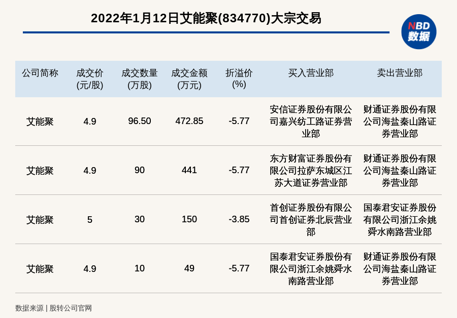 每经讯,2022年1月12日,新三板创新层公司艾能聚(834770)发生4笔大宗交易,总成交金额为1112.85万元,成交金额最高的一笔成交价4.9元/股,成交数量96.50万股,成交金额472.85万元,折价5.77%。买入营业部是安信证券股份有限公司嘉兴纺工路证券营业部,卖出营业部是财通证券股份有限公司海盐秦山路证券营业部。