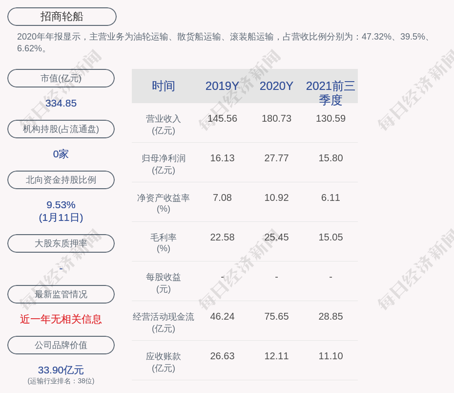 2020年年报显示,招商轮船的主营业务为油轮运输、散货船运输、滚装船运输,占营收比例分别为:47.32%、39.5%、6.62%。