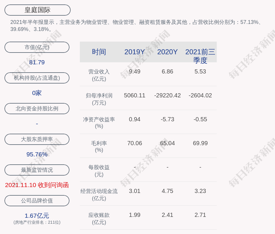 2021年半年报显示,皇庭国际的主营业务为物业管理、物业管理、融资租赁服务及其他,占营收比例分别为:57.13%、39.69%、3.18%。
