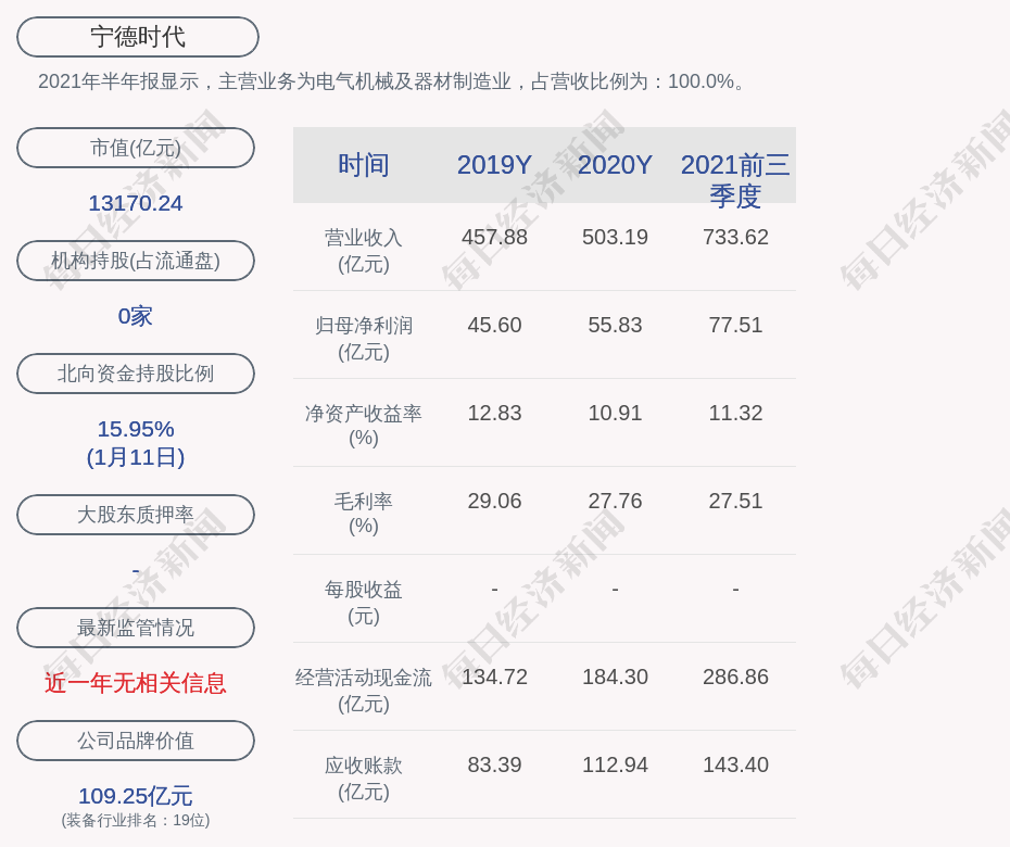2021年半年报显示,宁德时代的主营业务为电气机械及器材制造业,占营收比例为:100.0%。