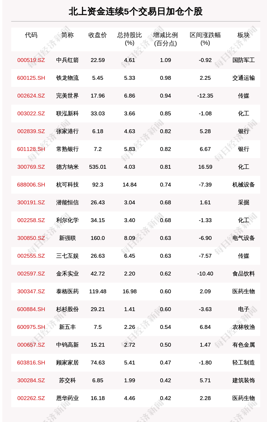 每经AI快讯,1月12日,北上资金连续5个交易日买入68个股。北上资金连续5个交易日加仓个股中,中兵红箭(000519.SZ,收盘价:22.59元)增持比例增幅最大,5个交易日增持1.09个百分点,其他增持比例较大的个股包括铁龙物流(600125.SH,收盘价:5.45元)、完美世界(002624.SZ,收盘价:17.96元)、联泓新科(003022.SZ,收盘价:33.03元),分别增持0.98个百分点、0.94个百分点、0.85个百分点。