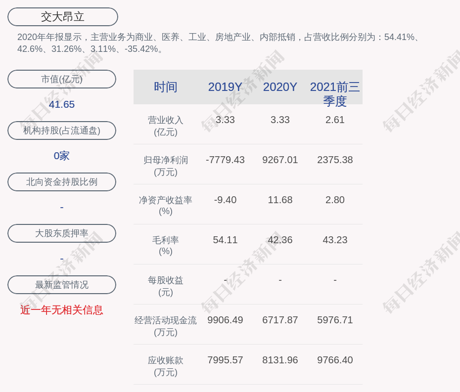 2020年年报显示,交大昂立的主营业务为商业、医养、工业、房地产业、内部抵销,占营收比例分别为:54.41%、42.6%、31.26%、3.11%、-35.42%。