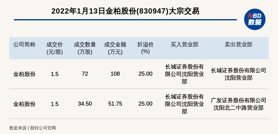 每经讯,2022年1月13日,新三板基础层公司金柏股份(830947)发生2笔大宗交易,总成交金额为159.75万元,成交金额最高的一笔成交价1.5元/股,成交数量72万股,成交金额108万元,溢价25%。买入营业部是长城证券股份有限公司沈阳营业部,卖出营业部是长城证券股份有限公司沈阳营业部。