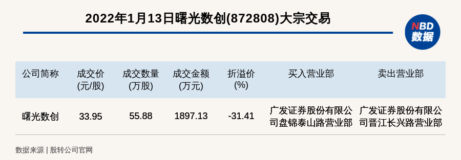 每经讯,2022年1月13日,新三板创新层公司曙光数创(872808)发生一笔大宗交易,成交价33.95元/股,成交数量55.88万股,成交金额1897.13万元,折价31.41%。买入营业部是广发证券股份有限公司盘锦泰山路营业部,卖出营业部是广发证券股份有限公司晋江长兴路营业部。