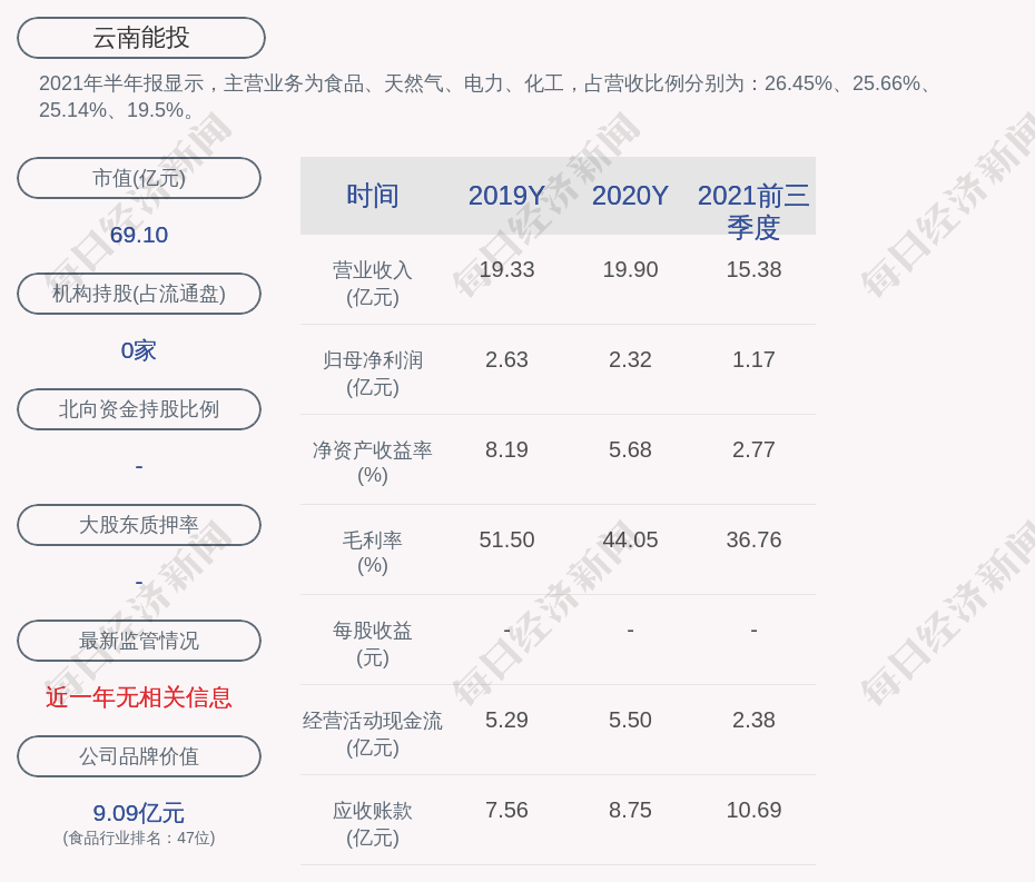 2021年半年报显示,云南能投的主营业务为食品、天然气、电力、化工,占营收比例分别为:26.45%、25.66%、25.14%、19.5%。