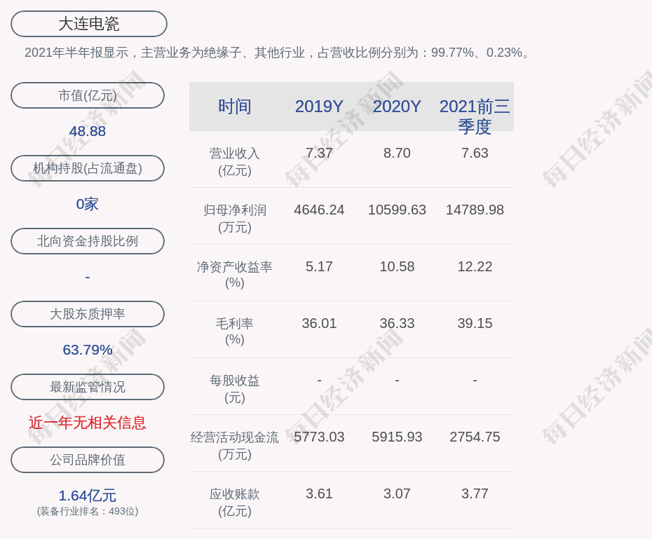 2021年半年报显示,大连电瓷的主营业务为绝缘子、其他行业,占营收比例分别为:99.77%、0.23%。
