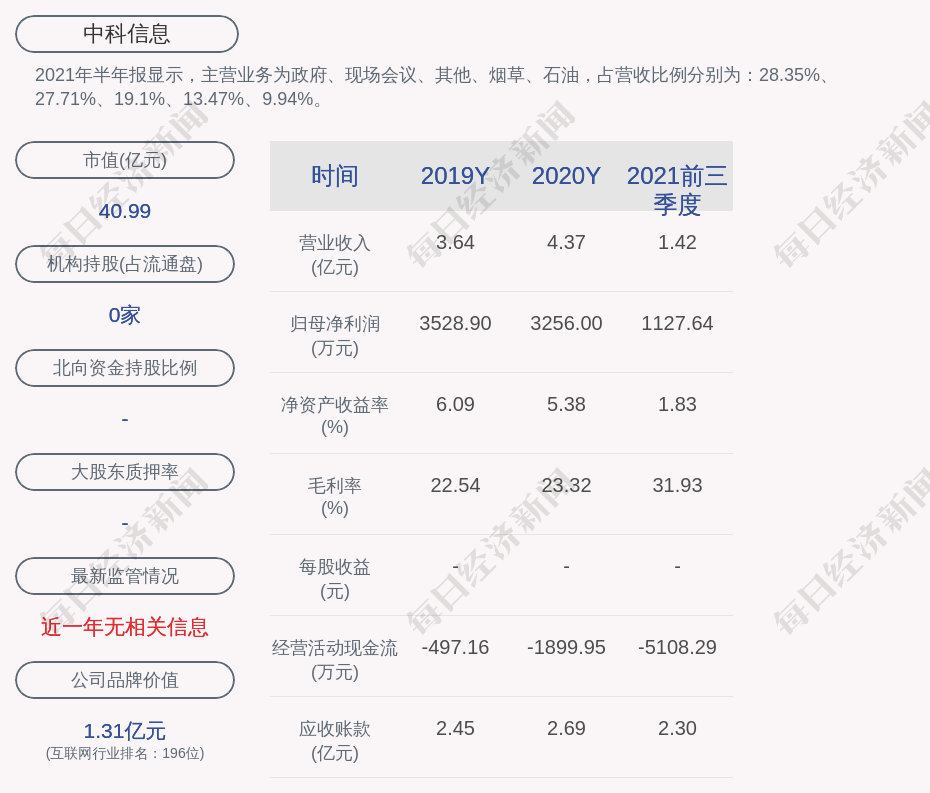 2021年半年报显示,中科信息的主营业务为政府、现场会议、其他、烟草、石油,占营收比例分别为:28.35%、27.71%、19.1%、13.47%、9.94%。
