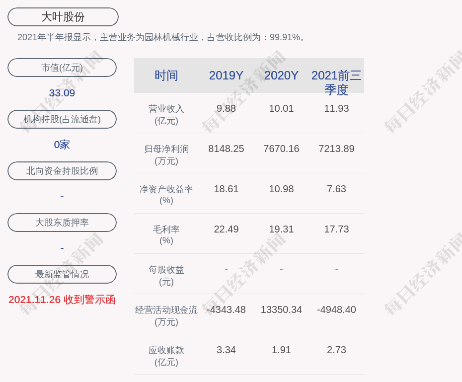 2021年半年报显示,大叶股份的主营业务为园林机械行业,占营收比例为:99.91%。