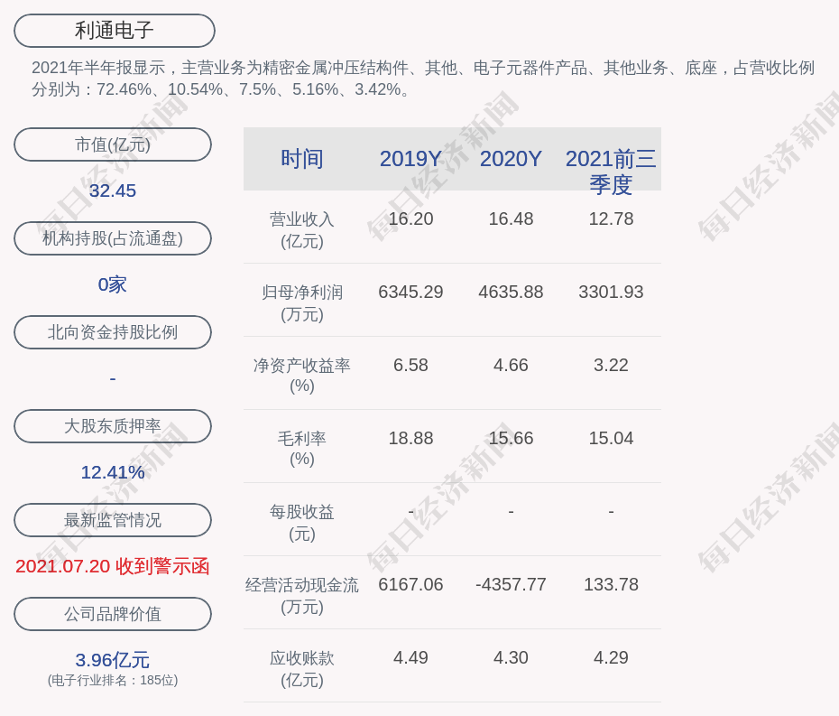 2021年半年报显示,利通电子的主营业务为精密金属冲压结构件、其他、电子元器件产品、其他业务、底座,占营收比例分别为:72.46%、10.54%、7.5%、5.16%、3.42%。