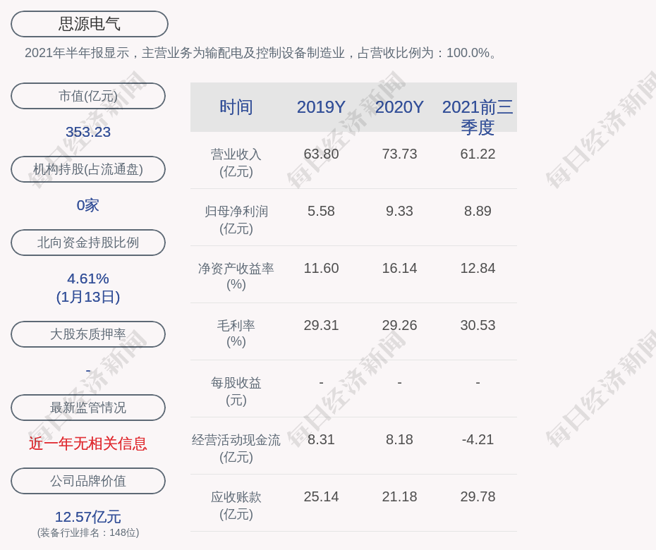 2021年半年报显示,思源电气的主营业务为输配电及控制设备制造业,占营收比例为:100.0%。