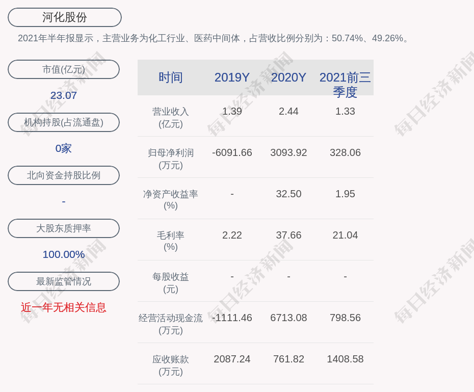 2021年半年报显示,河化股份的主营业务为化工行业、医药中间体,占营收比例分别为:50.74%、49.26%。